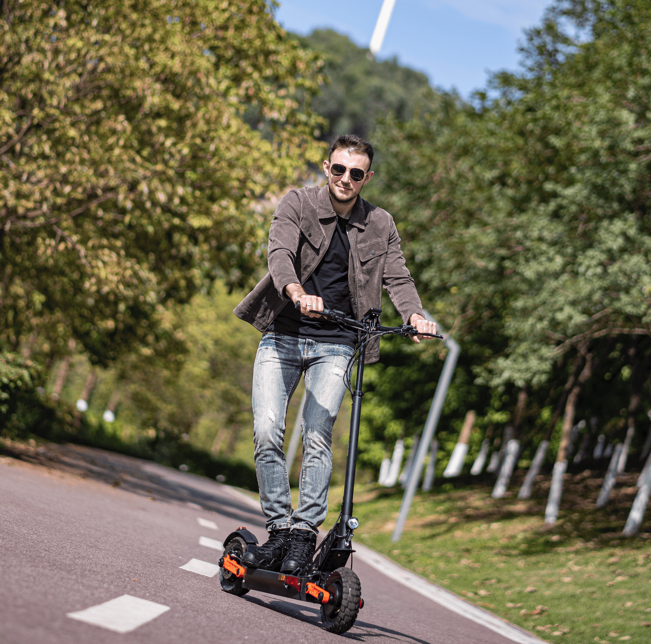 Der E-Scooter S5 ABE verfügt über einen bürstenlosen 500-W-Motor für schnelle Beschleunigung und 20-Grad-Bergauffahrten und erreicht auf unterschiedlichem Gelände Höchstgeschwindigkeiten von 20 km/h.