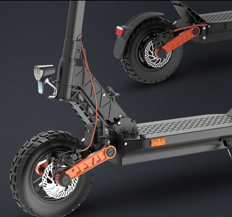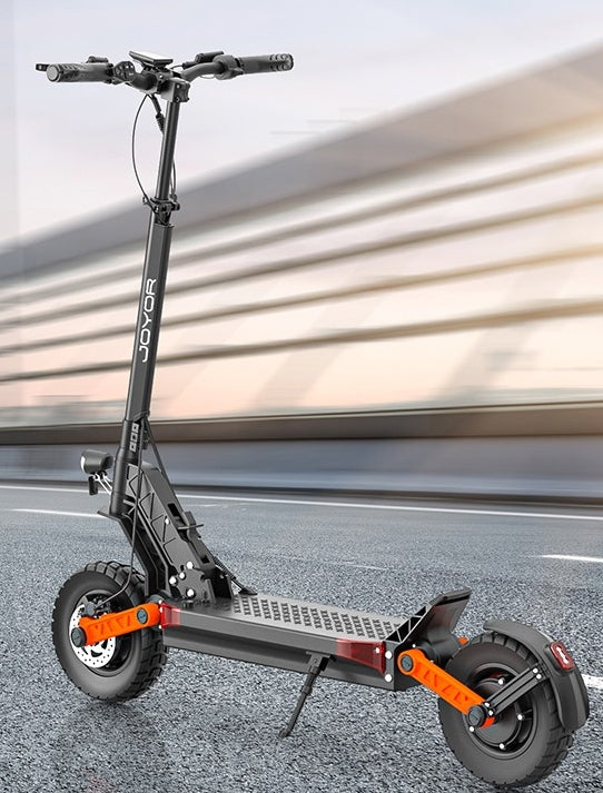 Joyor S8 features a 600W electric motor for powerful acceleration, large wheels, and swingarm suspension for a smooth ride on any terrain. Its aerospace-grade aluminum frame is lightweight yet durable. The 600W brushless motor provides strong power.