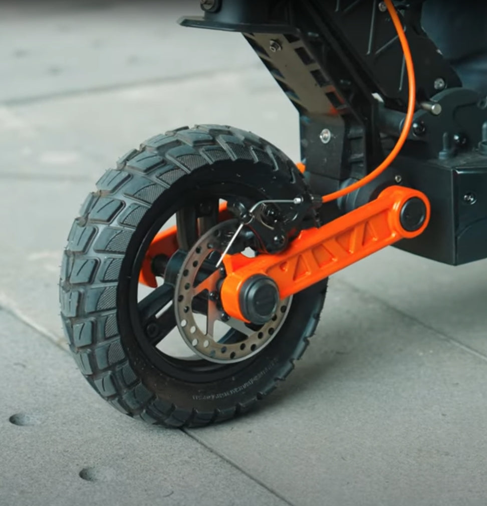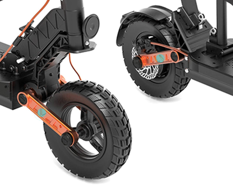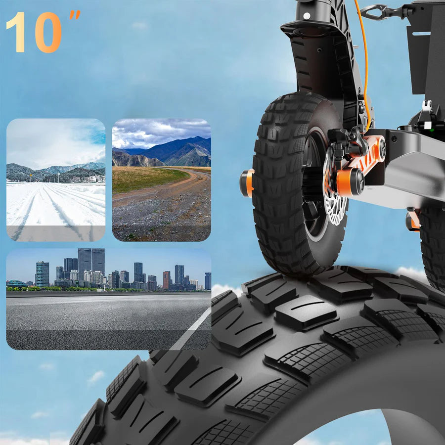 The S series boasts patented rubber suspension, superior shock absorbers for comfort, and precise mechanical brakes for safety, with anti-slip pedals for high-speed and off-road security.The scooter is equipped with 10-inch pneumatic tires to ensure a smooth, shock-absorbing ride on bumpy roads.