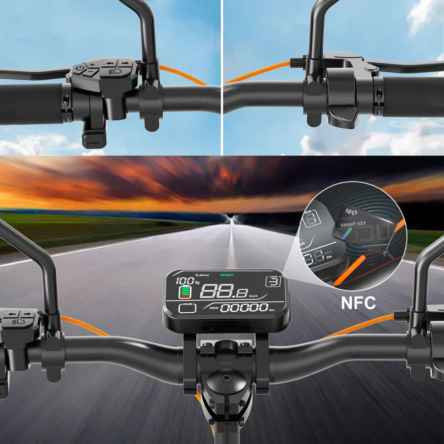 The high-definition LCD screen displays riding information in real time. The ergonomically designed one-piece handlebar is equipped with an integrated speaker and rearview mirror to improve driving safety. The finger-pressure throttle can accurately decelerate, and the multi-function keyboard can easily switch between different riding modes.
