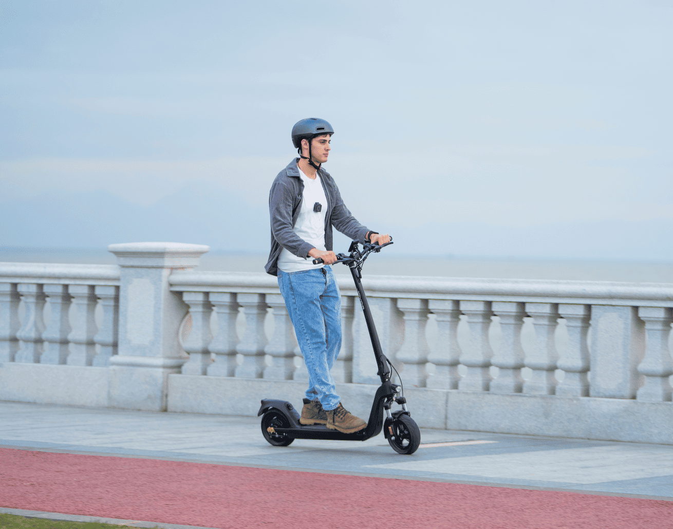 The C10E electric scooter is equipped with a high-definition display to display riding data, an ergonomic handlebar with a bell for precise speed control, and a multi-function button to switch modes.